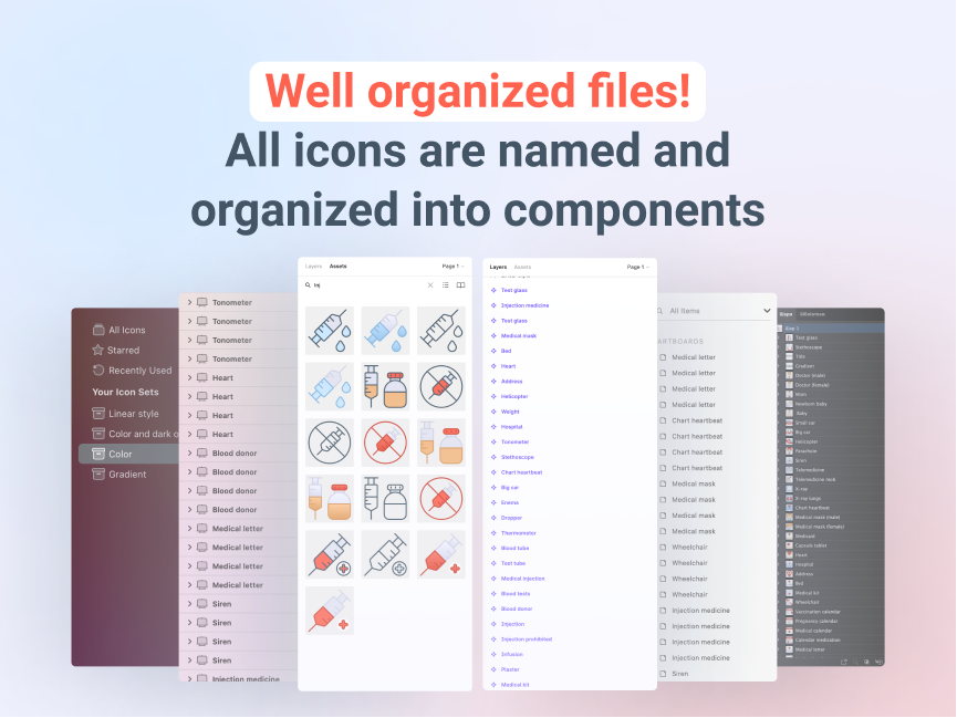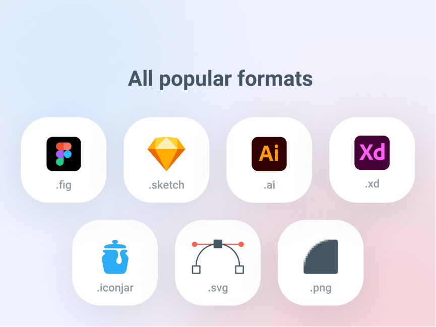 Figma, Sketch, Adobe XD, Adobe Illustrator, IconJar source files, SVG & PNG files
